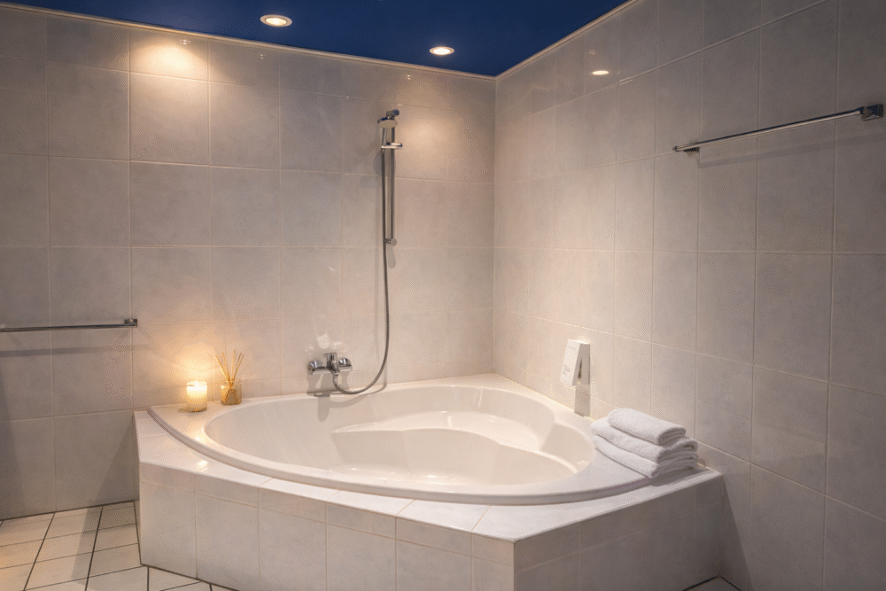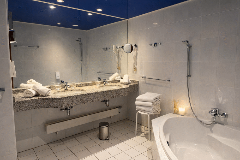 Das geräumige und elegante Badezimmer ist mit einer Eckbadewanne ausgestattet, die nach einem erlebnisreichen Tag in Clervaux und der Region zum Entspannen einlädt.