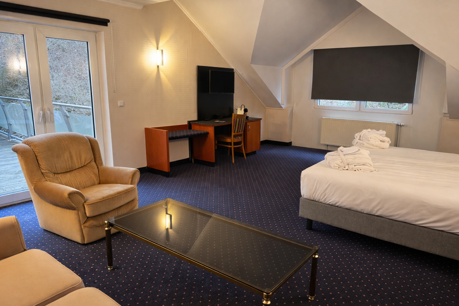 Das geräumige und helle Familienzimmer des Hotels Koener ist so konzipiert, dass es Jung und Alt in einer komfortablen und beruhigenden Umgebung willkommen heißt. Unter dem Dach gelegen, besticht es durch seine großzügigen Räume, seine charmanten Mansardendächer und seine gemütliche Atmosphäre, ideal für einen Familienaufenthalt im Herzen der luxemburgischen Ardennen.